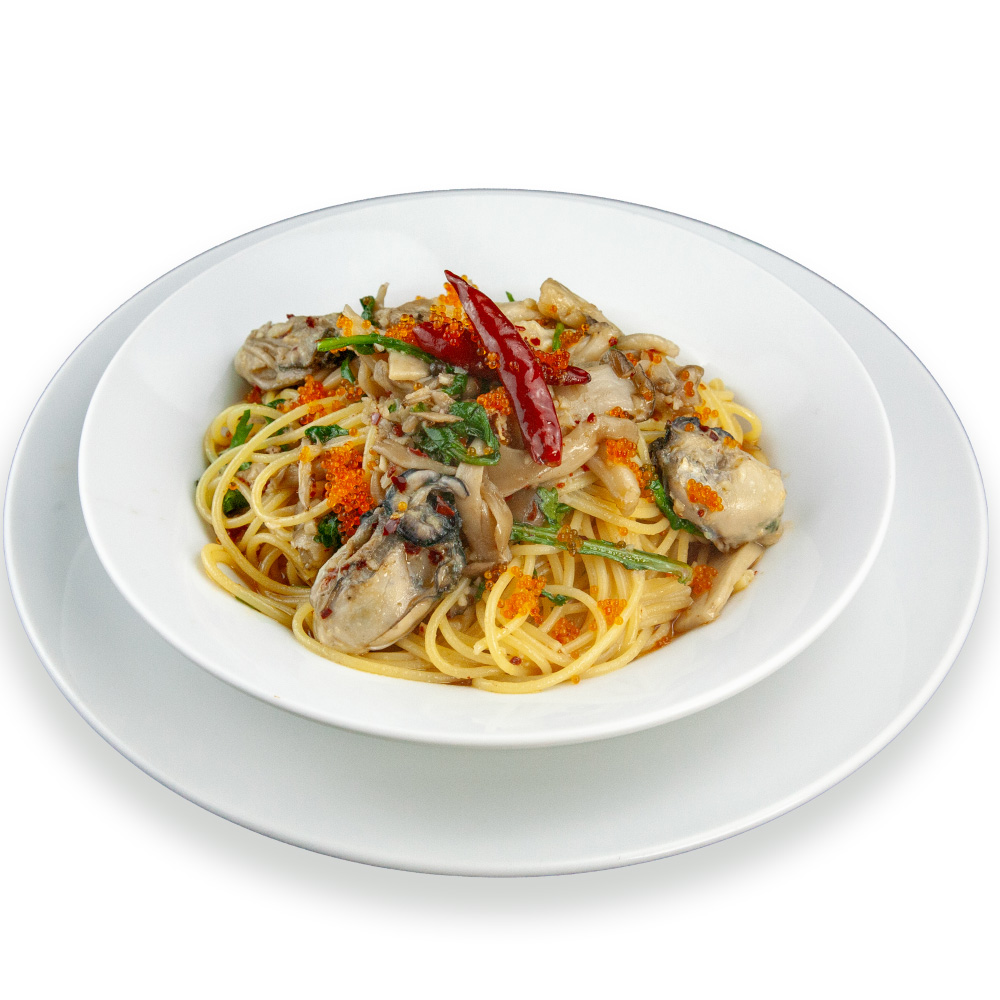 ぷりぷりの牡蠣と相性抜群の春菊、香り豊かなきのこが絶妙に絡み合い、旬の食材を楽しめるペペロンチーノ。